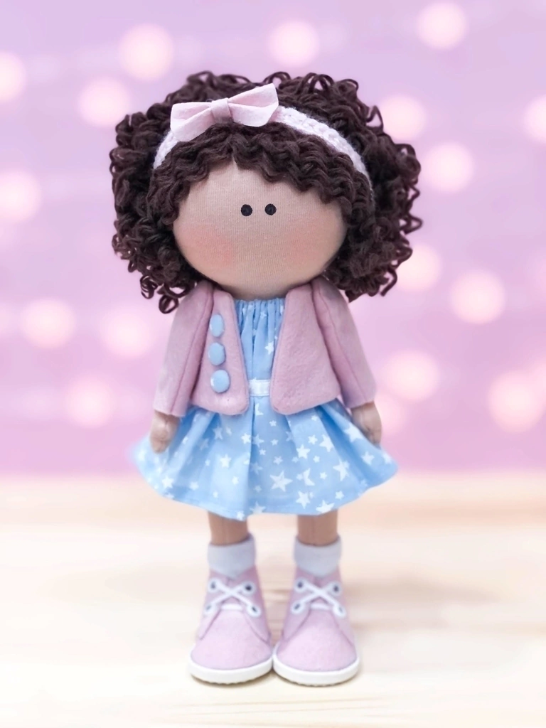 Essa Boneca Russa é a combinação perfeita de estilo e charme! Com 28cm de pura fofura, ela vem vestida em um lindo vestido azul com estrelinhas brancas, cabelos cacheados castanho escuro e uma pele morena clara.