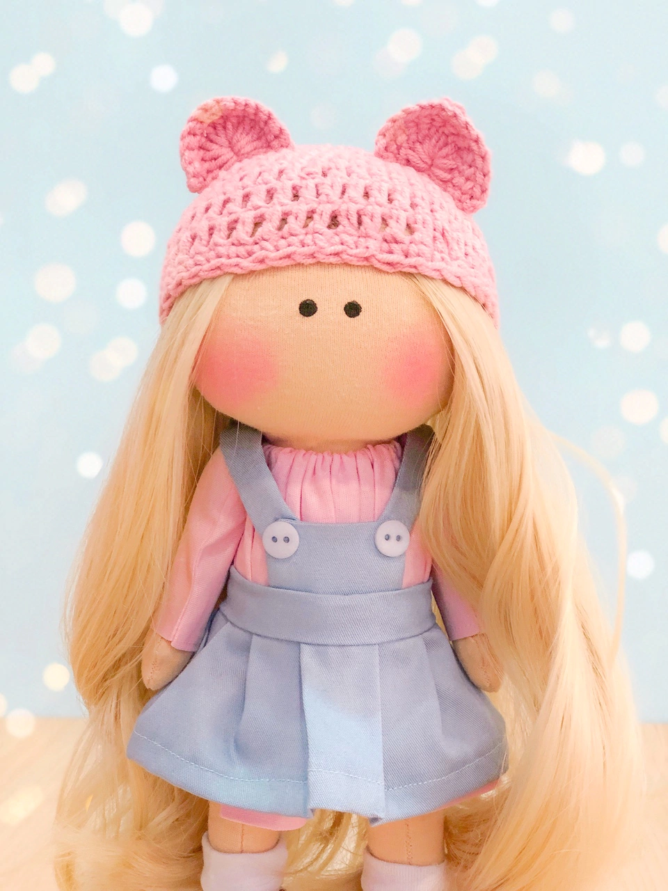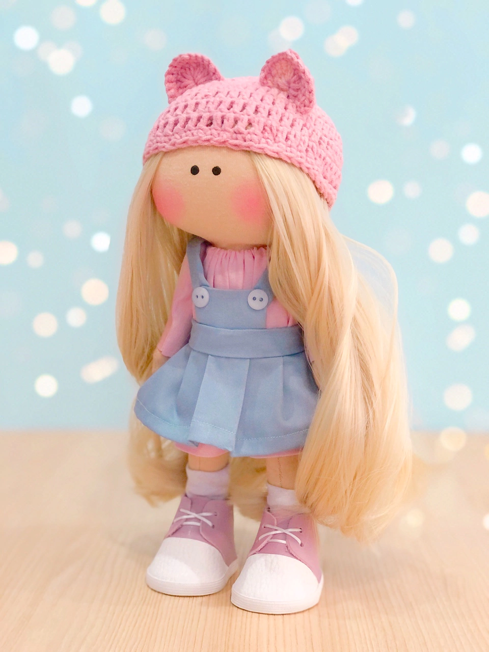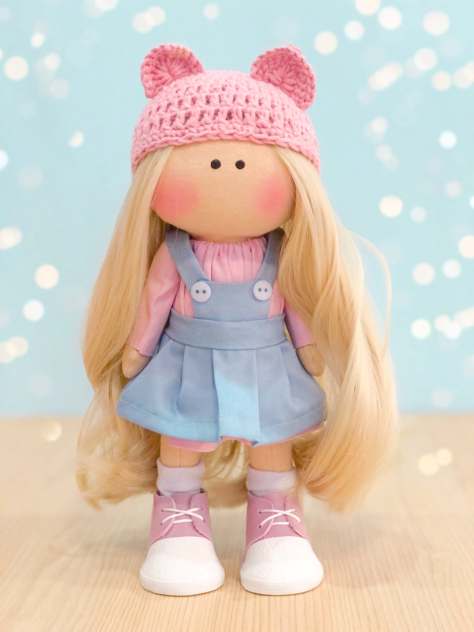 Essa é a Maria de Pano mais fofa que você vai conhecer! Com um vestido rosa bebê que faz você querer dar um abraço e uma jardineira azul bebê que é pura elegância, ela é a verdadeira definição de delicadeza. Para completar o visual, um tênis modelo all star rosa e uma touca rosa em crochê com orelhas de bichinho que vai fazer todos os pequenos (e os grandes também!) sorrirem.