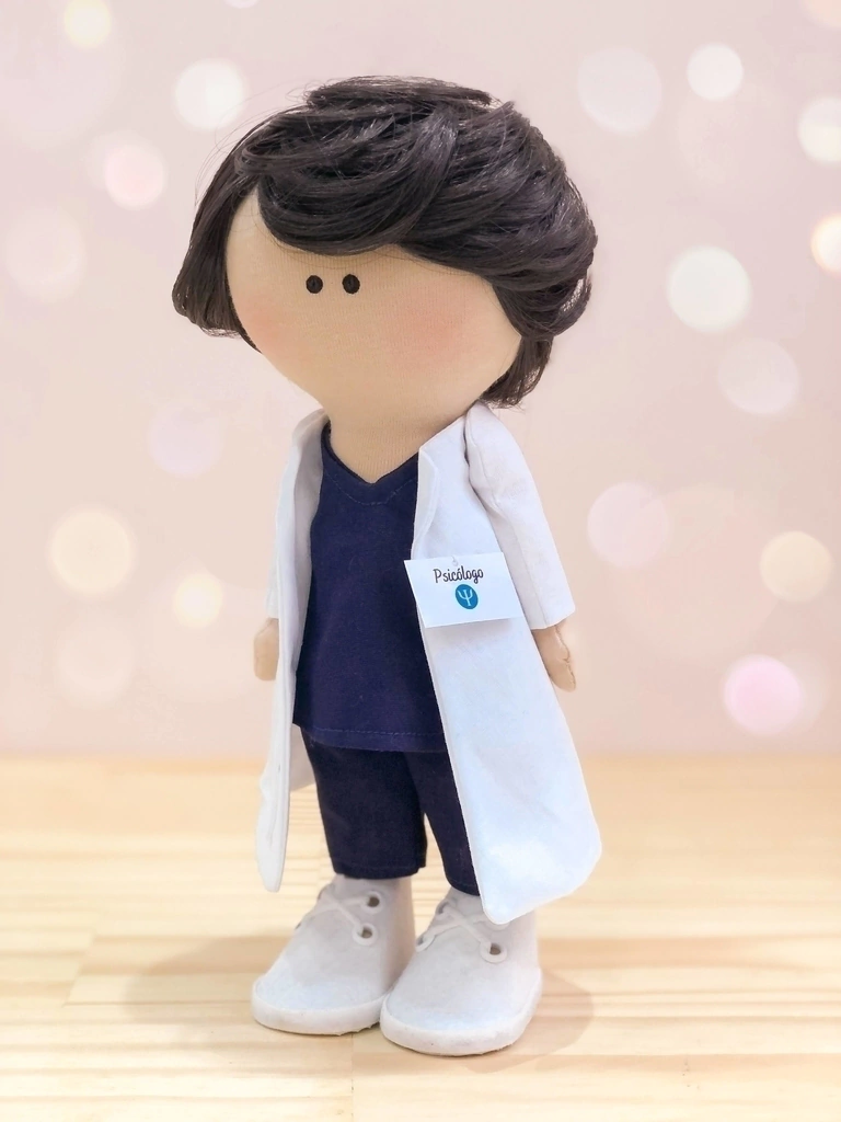 Este encantador Boneco Psicólogo é o presente perfeito para aqueles que têm uma paixão pela Psicologia. Vestindo uma elegante calça e blusa azul marinho, o Joãozinho exibe um look característico com um jaleco branco que conta com um bolso lateral prático. Para completar sua aparência profissional, ele usa tênis brancos e um crachá que identifica sua profissão.