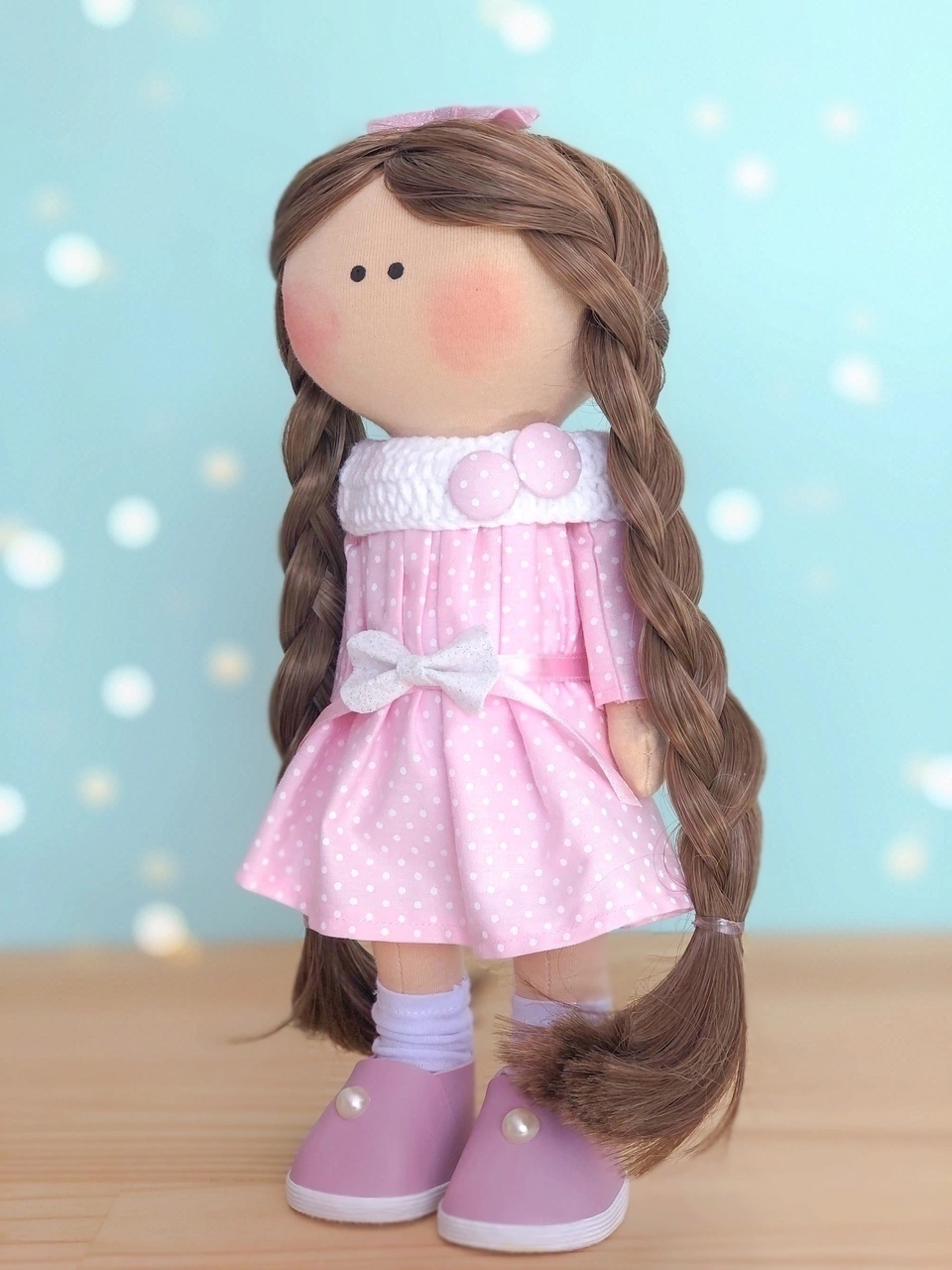 Você já conheceu a nossa Maria de Pano com trancinhas? Se não, prepare-se para se apaixonar! Com um vestido rosa bebê cheio de bolinhas brancas e um par de sapatos rosa com lacinhos, ela é a verdadeira definição de fofura! 👗✨